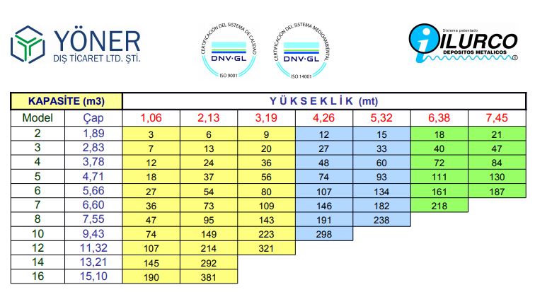 ILURPRELAC kapasite aralığı tablosu aşağıdaki gibidir: